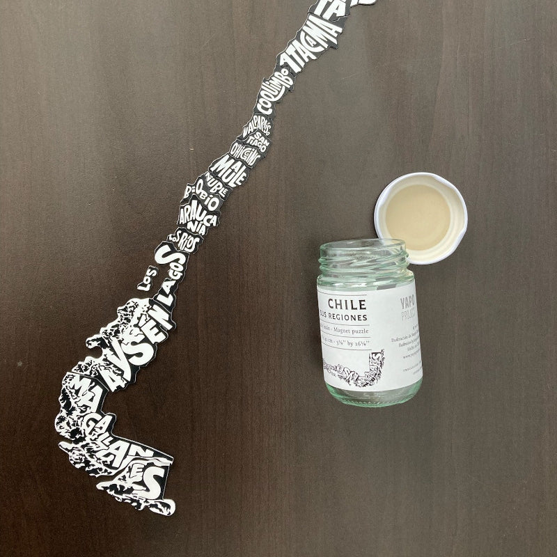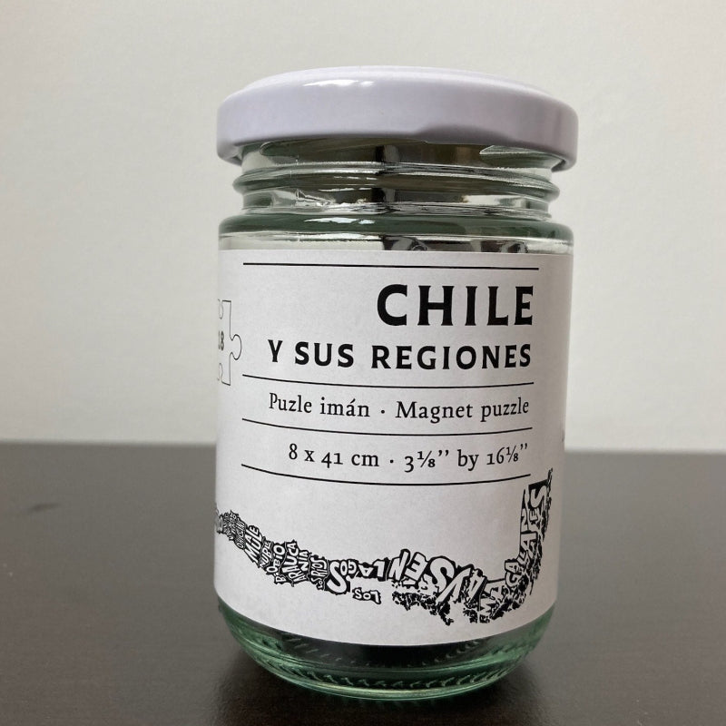 Puzzle magnético de las regiones de Chile impreso en serigrafía en frasco de vidrio. Armado mide 8 x 42 cm.